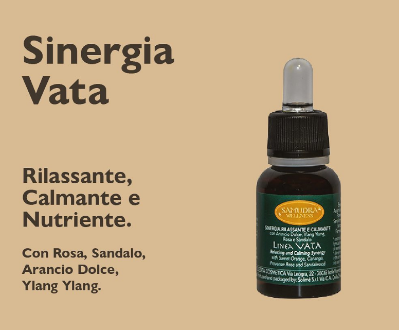 La linea Vata basa i suoi principi sulla filosofia ayurvedica: l’energia Vata è infatti composta dagli elementi di Aria e Spazio e influenza il sistema nervoso, gli organi motori ed è responsabile dell’eliminazione delle scorie. I prodotti di questa linea hanno una funzione rilassante, calmante, decontratturante ed idratante poiché agisce sul piano emozionale, sul sistema nervoso, sulle infiammazioni e sulla cellulite dolorosa.