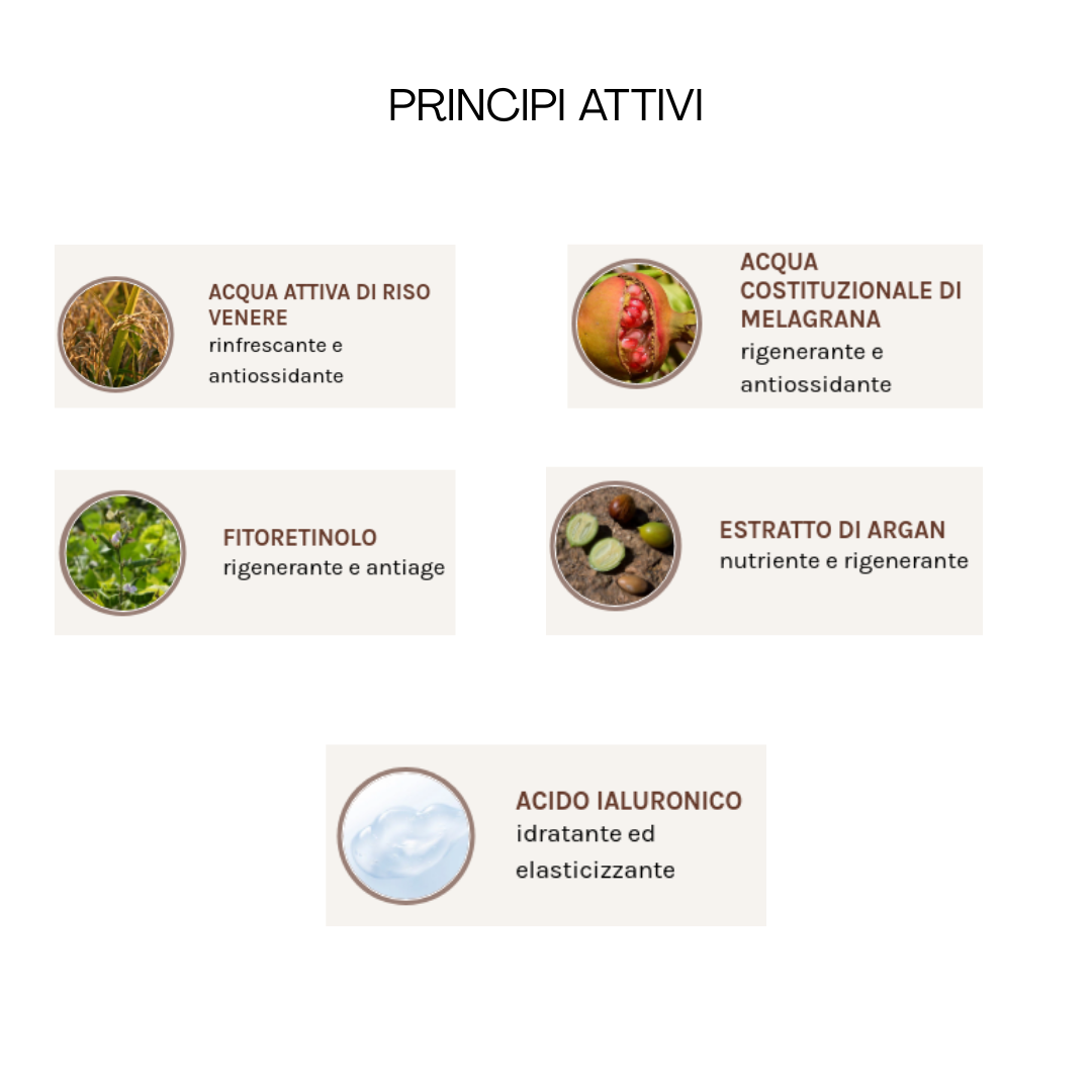 È fatta con 5 oli vegetali nutrienti (Karitè, Baobab, Argan, Jojoba e Oliva) e contiene anche Fitoretinolo (Vitamina A naturale) per stimolare il rinnovamento cellulare e un mix di agenti antiossidanti e antietà (Vitamina E, Acido Ialuronico ed Estratto di Riso) per una pelle fresca, luminosa e senza tempo.