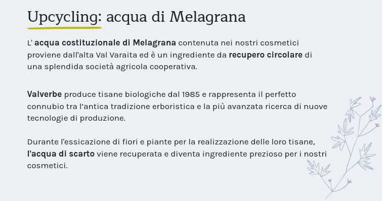 Contiene la melagrana da cui estraiamo, attraverso un processo di essiccazione a cellula aperta dal tessuto costitutivo del frutto, un elisir ricco di antiossidanti, vitamine e minerali preziosi per la nostra pelle.