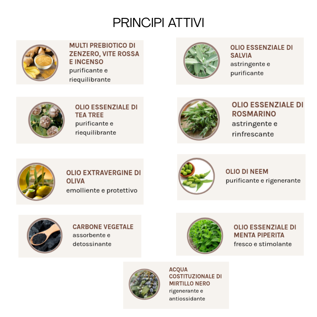 - gli oli di Neem, di Rosmarino, di Salvia, di Tea Tree che svolgono un’azione sinergica antibatterica, seboregolatrice e cicatrizzante;