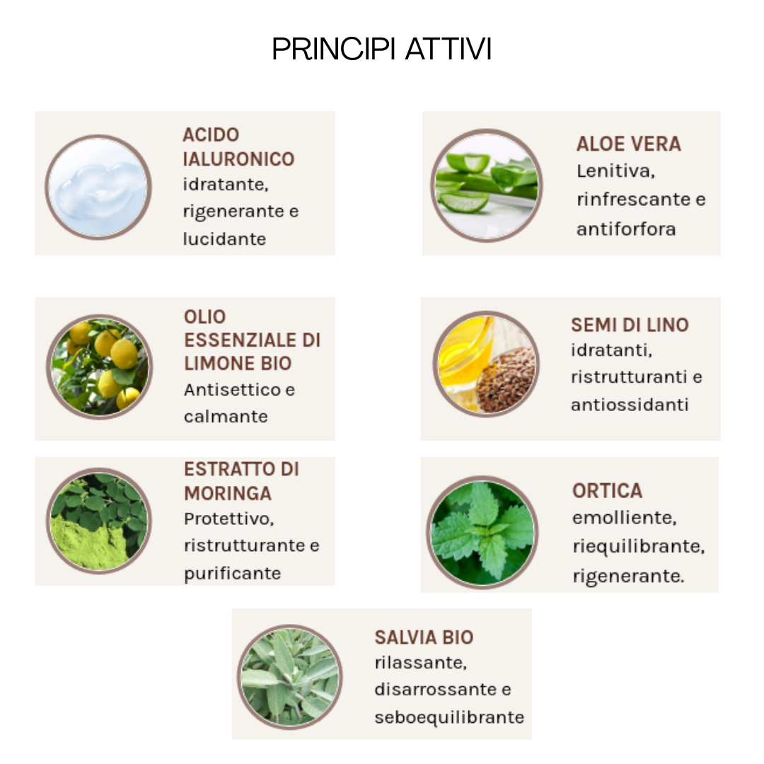 Completa la routine con lo Shampoo Salvia bio e Limone e con la Maschera Cocco bio e Ialuronico.
