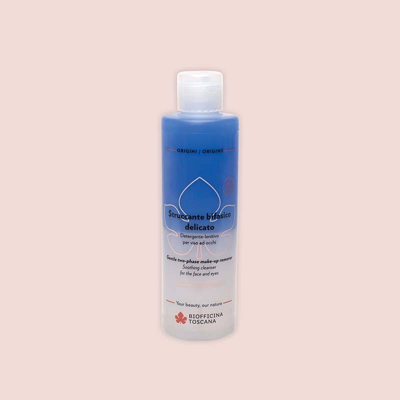 Struccante bifasico viso-occhi con una fase acquosa ed una oleosa per un’azione struccante delicata ed una pulizia quotidiana. La fase oleosa - con oli leggeri - rimuove il trucco dolcemente ma in modo efficace, mentre gli idrolati di fiordaliso, camomilla ed eufrasia con l’estratto di avena bio toscana svolgono un’azione calmante e lenitiva.