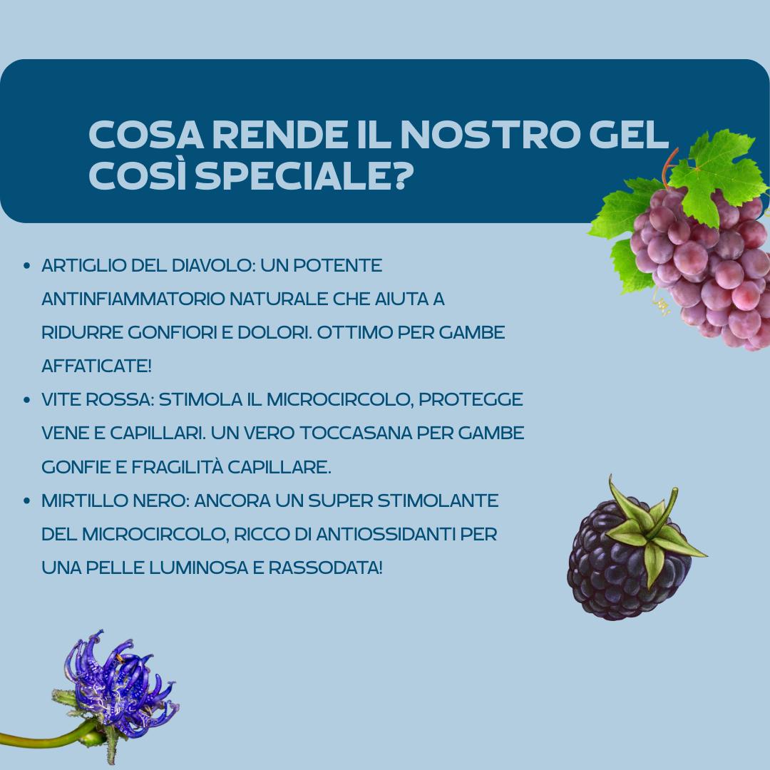 - Gel lenitivo e rinfrescante: Artiglio del Diavolo, Vite Rossa, Mirtillo e Ippocastano.