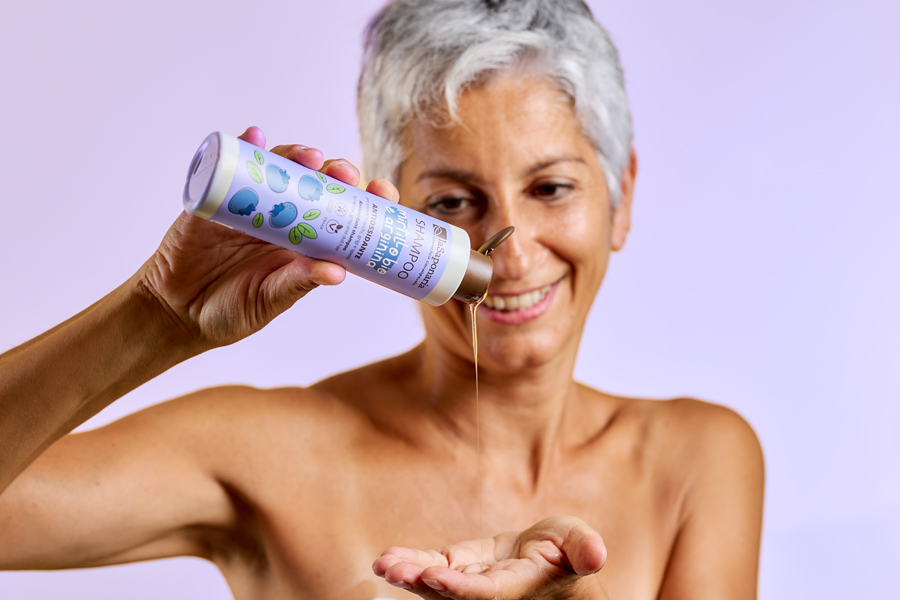 Se vuoi eliminare le sfumature gialle tipiche di capelli bianchi e grigi applica a seguire la Maschera Anti-giallo Mirtillo bio e Amla.