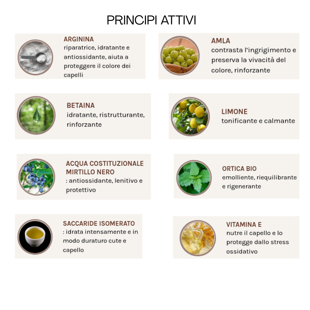 Arginina che aiuta a limitare la perdita di umidità del fusto e a mantenere la chioma idratata e flessibile, riducendo i capelli che si spezzano.;