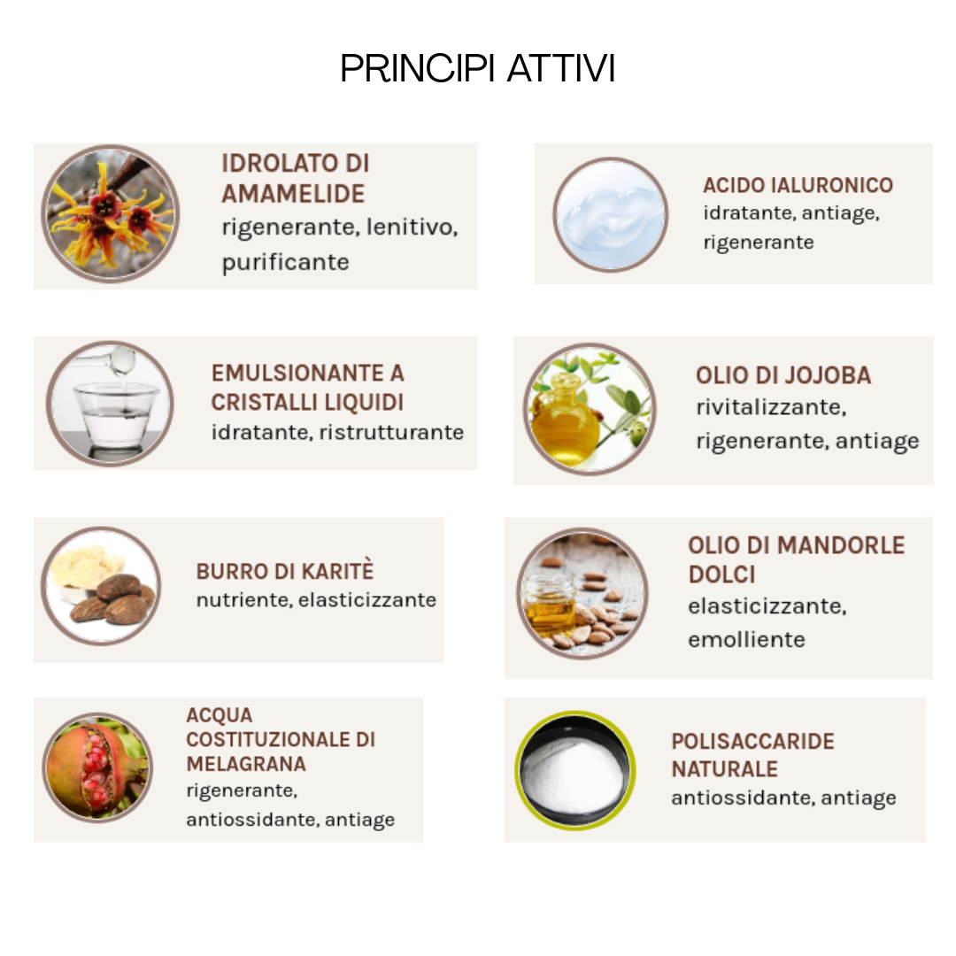 Aqua,Glycerin, Punica Granatum Fruit Water*, Helianthus Annuus Seed Oil*, Cetearyl Alcohol, Caprylic/Capric Triglyceride, Propanediol, Coco-Caprylate/Caprate, Cetearyl Glucoside, Sorbitan Olivate, Hamamelis Virginiana Leaf Water*, Butyrospermum Parkii Butter*, Sodium Hyaluronate, Lauroyl Lysine, Glyceryl Caprylate, Pullulan, Tocopherol, Polyhydroxystearic Acid, Mica, Ascorbyl Palmitate,Lecithin,Xanthan Gum, Sodium Phytate, Parfum**,Citric Acid, Sodium Dehydroacetate,Benzoic Acid,Benzyl Alcohol, Cananga Odorata Oil / Extract, Pelargonium Graveolens Flower Oil, Vanillin, Citrus Aurantium Bergamia Peel Oil, Geraniol, Linalool, Limonene MAY CONTAIN +/-: CI 77891, CI 77492, CI 77499 *da agricoltura biologica, **da ingredienti di origine naturale