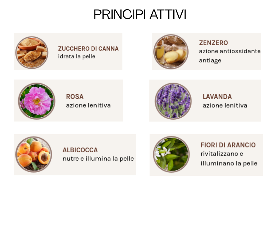 Lenitivo anche con le pelli più delicate grazie alla rosa damascena, all’albicocca e ai fiori di arancio ma al tempo stesso energizzante e stimolante grazie allo zenzero e al suo profumo paradisiaco.