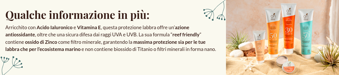 Il formato compatto del Burro Labbra SPF 50 ti consente di portarlo ovunque, offrendoti anche la versatilità di utilizzarlo come protezione da viaggio per naso e guance in situazioni di emergenza. Per una protezione specifica del viso, consigliamo l'uso della Crema Solare Spf 50 arricchita con Acido Ialuronico per contrastare l'invecchiamento cutaneo.